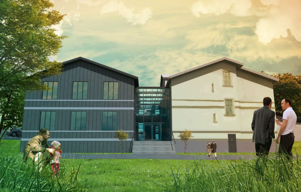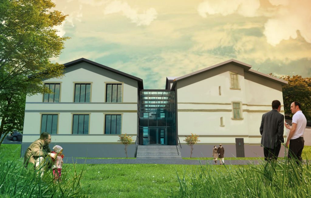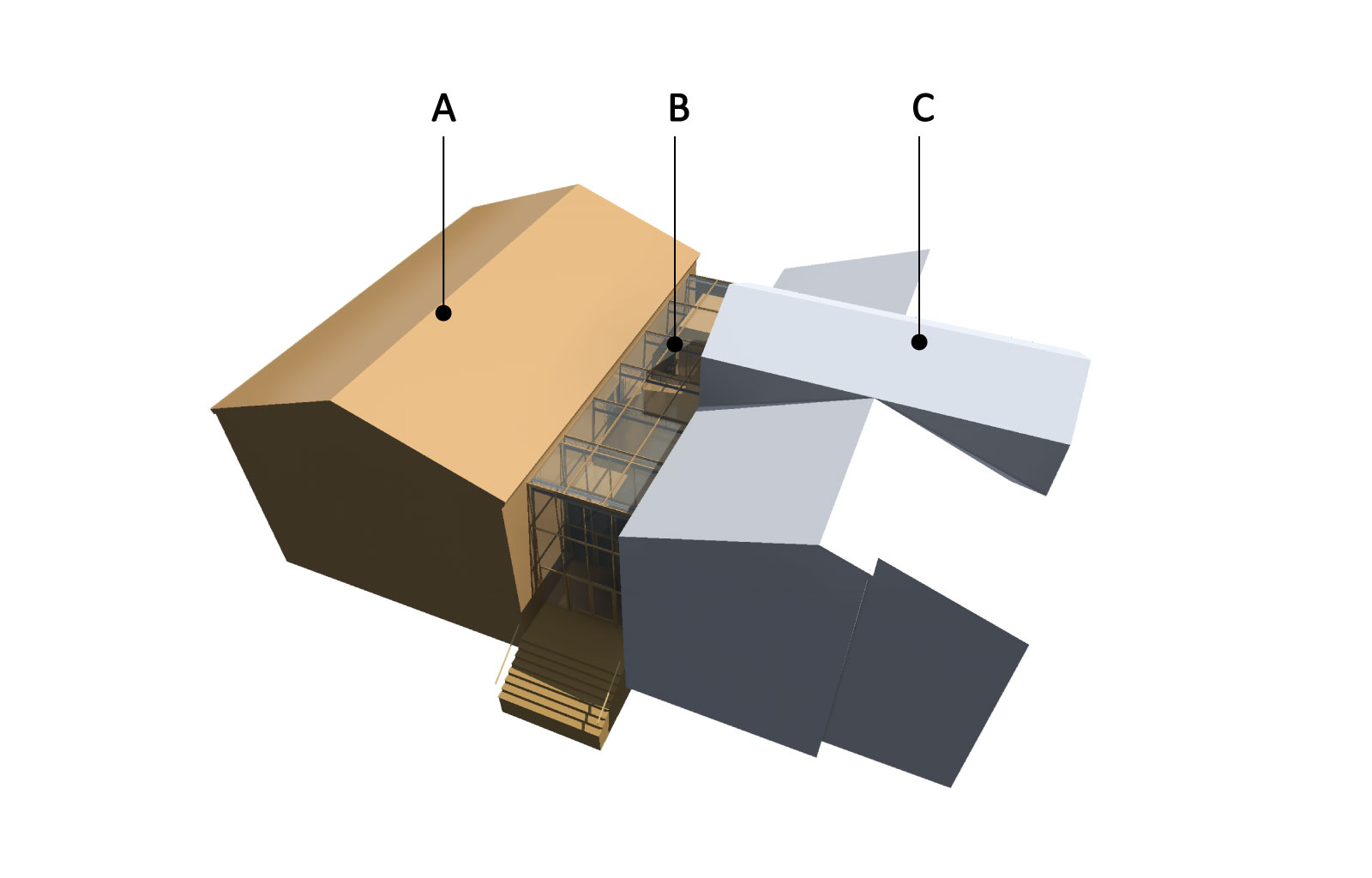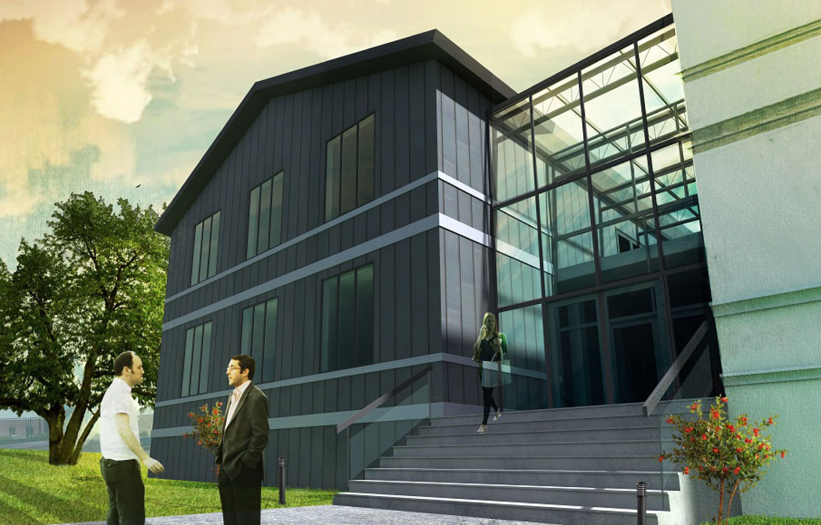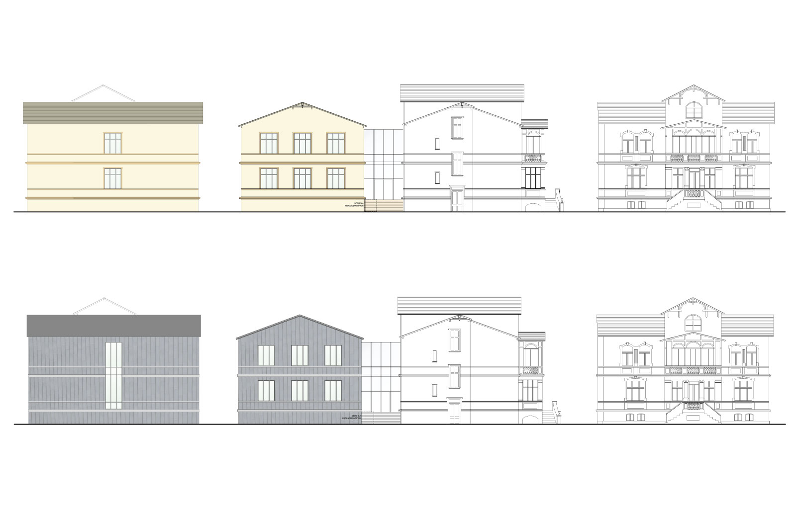 Von der Fassade des Anbaus entstanden zwei Varianten. Die erste Variante übernimmt die bestehende dekorative Fassade, während die zweite Variante sie auf einer modernen Art und Weise adaptiert.