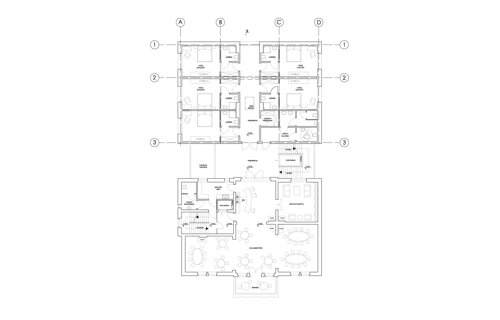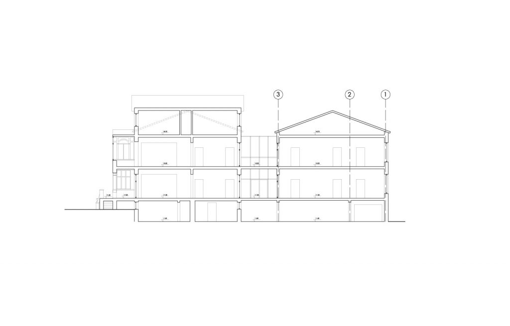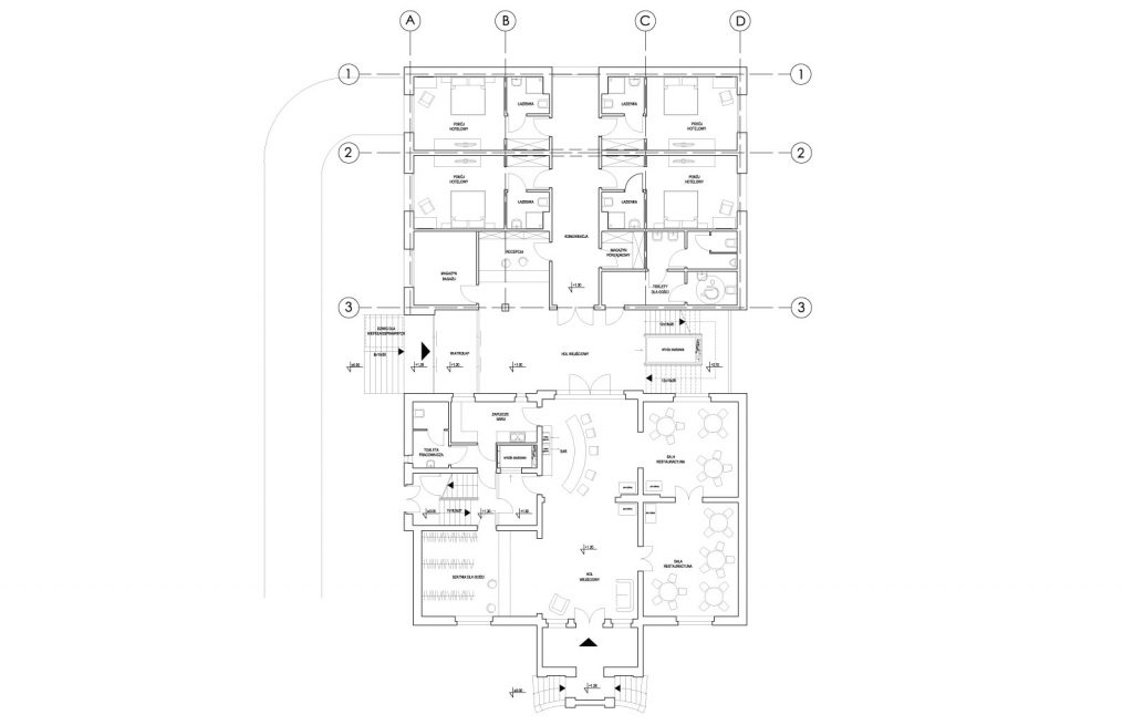 Unsere Aufgabe war es, eine neue Nutzung für das Gebäude zu finden. Wir haben das bestehende Gebäude in ein Restaurant umgewandelt und um eine Hotelfläche erweitert. Das zweite Gebäude übernimmt die Proportionen des bestehenden und wurde mit einer verglasten Verkehrsfläche verbunden.