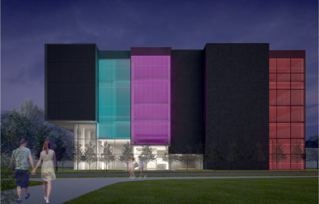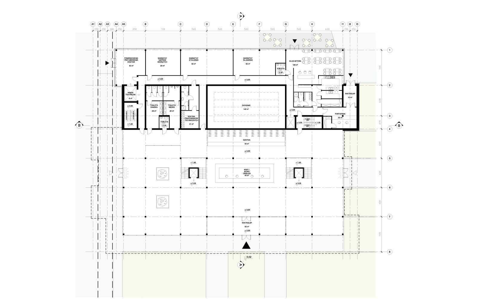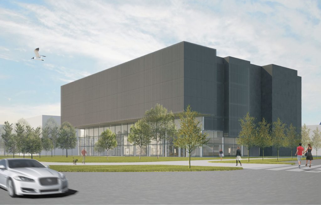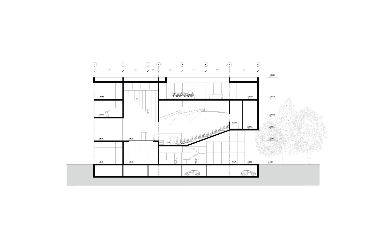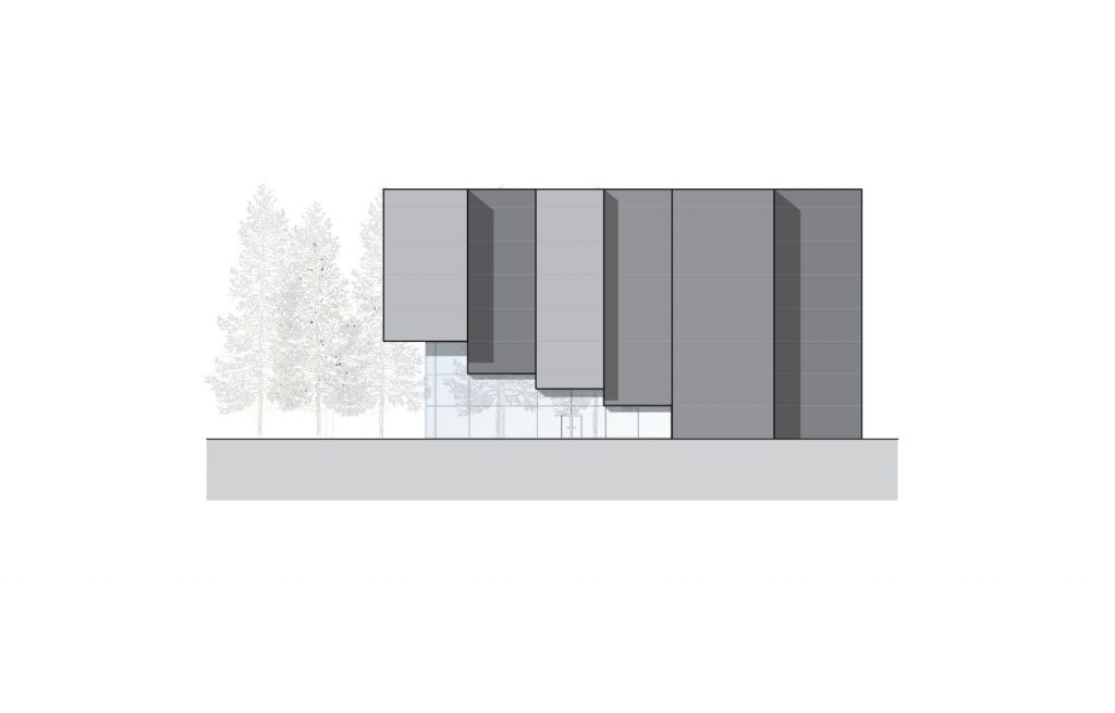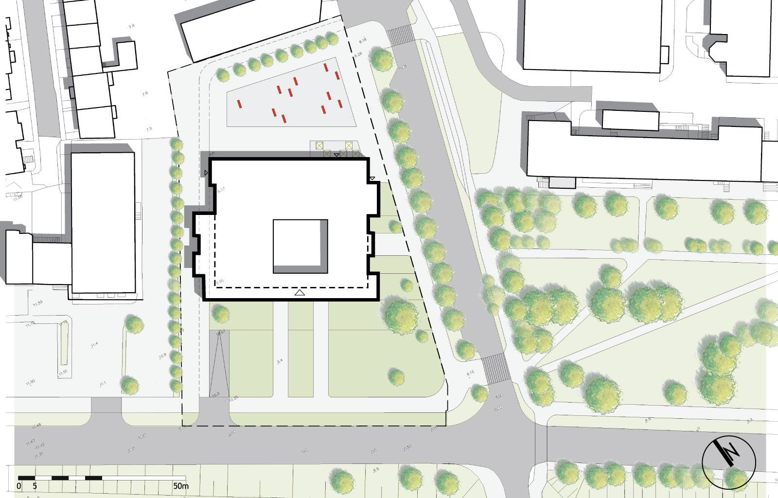 Die Idee lag darin, den Park von der anderen Straßenseite auf dem Vorplatz fortzuführen. Dank des Unterschnittes im Gebäudekörper fließt das Grüne in die Empfangshalle ein, wodurch das Ziel eines offenen Eingang erreicht wurde. Durch die offenen Glasfronten entsteht keine sichtbare Grenze zwischen Natur und Innenraum, wodurch der Empfangsbereich als Teil des Parks empfunden wird. Erst die Baumreihe an der Nordwestgrenze schließt die Grünflächen ab.