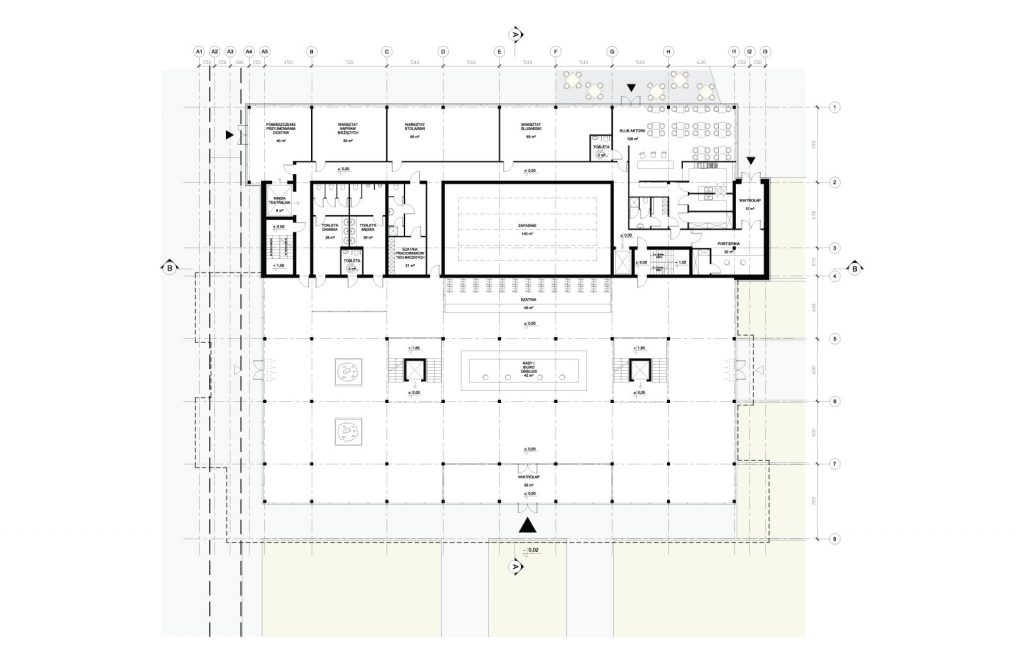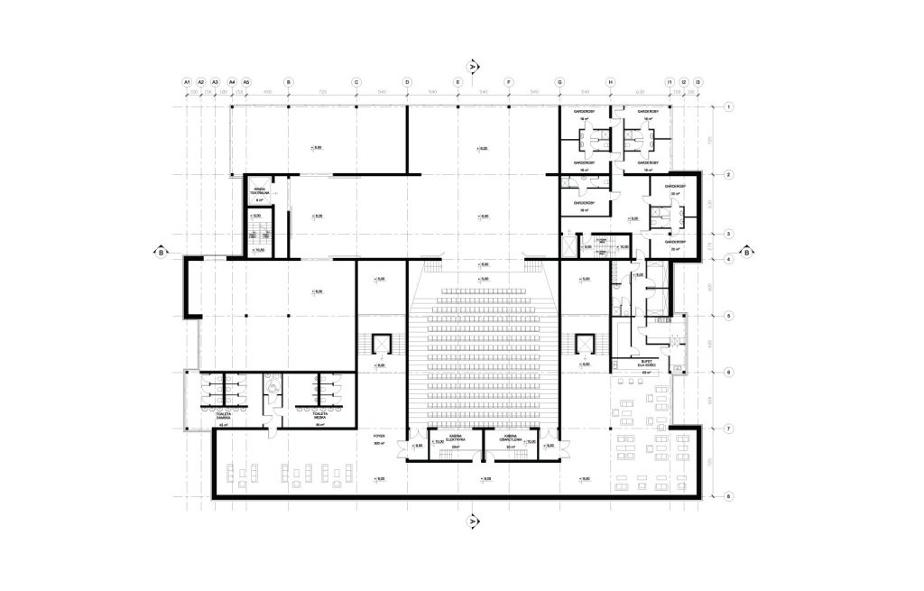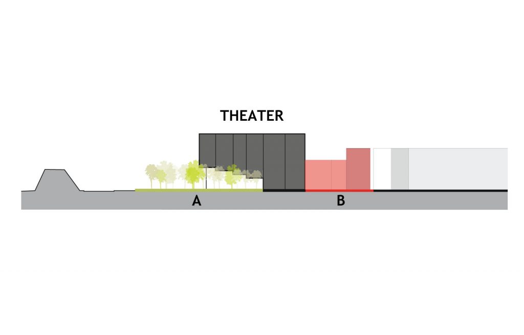 Das Gebäude wurde zentral auf das vorhandene Grundstück platziert. Dadurch entstanden zwei separate und unabhängige Stadträume erschaffen, die sich durch einen sehr gegensätzlichen Charakter auszeichnen. Der Platz vor dem Haupteingang besticht durch ein repräsentatives, grünes Vorfeld, während hinter dem Theater ein von drei Seiten geschützter, gemütlicher Platz entstanden ist.